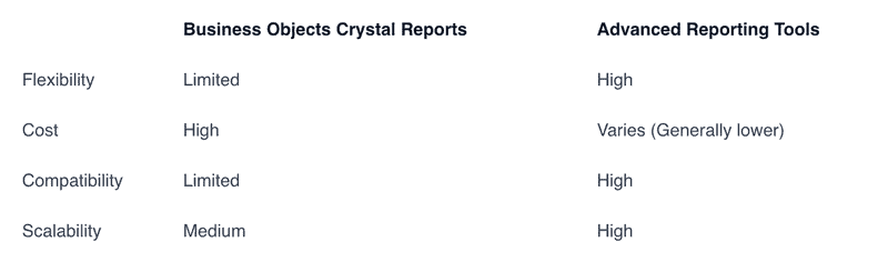 In essence, the reasons for migrating from Crystal Reports boil down to the need for flexibility, cost-effectiveness, cloud compatibility, platform longevity, and scalability. Here's a comparative table to put things into perspective in migrating: