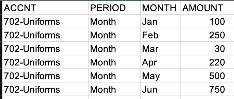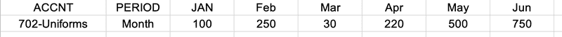So, where you had one row for 702-Uniforms, you can now expand it to 12, with one per month. The same for each additional record. With things unpivoted, you can easily calculate quarterly, calculate yearly, apply filters and where clauses, and do more analysis of the data.